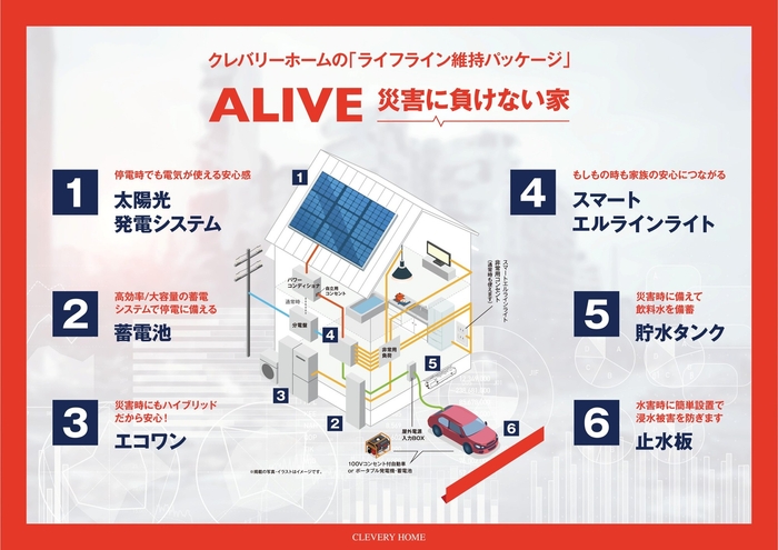太陽光発電、蓄電池、ハイブリッド給湯、貯水タンク、防水板など6点を標準装備し、