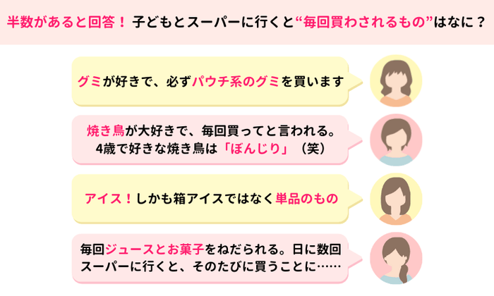お菓子以外では、ジュース、パンを挙げる声も多数ありました。「毎回ジュースとお菓子をねだられる。日に数回スーパーに行くと大変」など、一度きりではなく毎回となると、家計にも響いてきそうです。