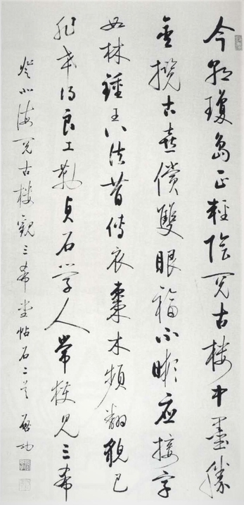 黒竜江省出身。数点の作品は美術専門書の模範作品となっている。本作では、大胆な着色のみならず背景に青緑山水を融合することで、新たな工筆仕女画を創新した。