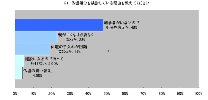 調査結果からは、仏壇処分を考えている48%が、継承者がいないため管理している仏壇を処分したいと考えていることがわかりました。