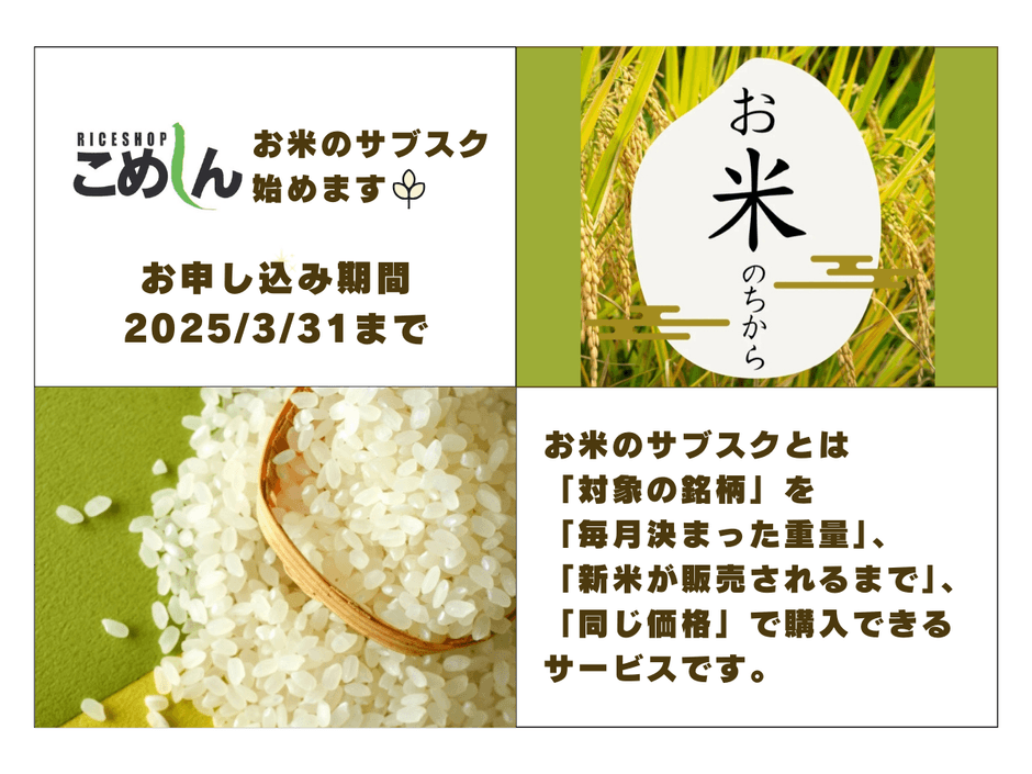 株式会社こめしん(本社:北海道釧路市、代表取締役:徳山 大介)は、店舗来店型『お米のサブスク』サービスの提供を2025年3月1日より開始しました。今年の新米時期までの期間限定で提供いたします。申込受付は3月31日までの予定です。