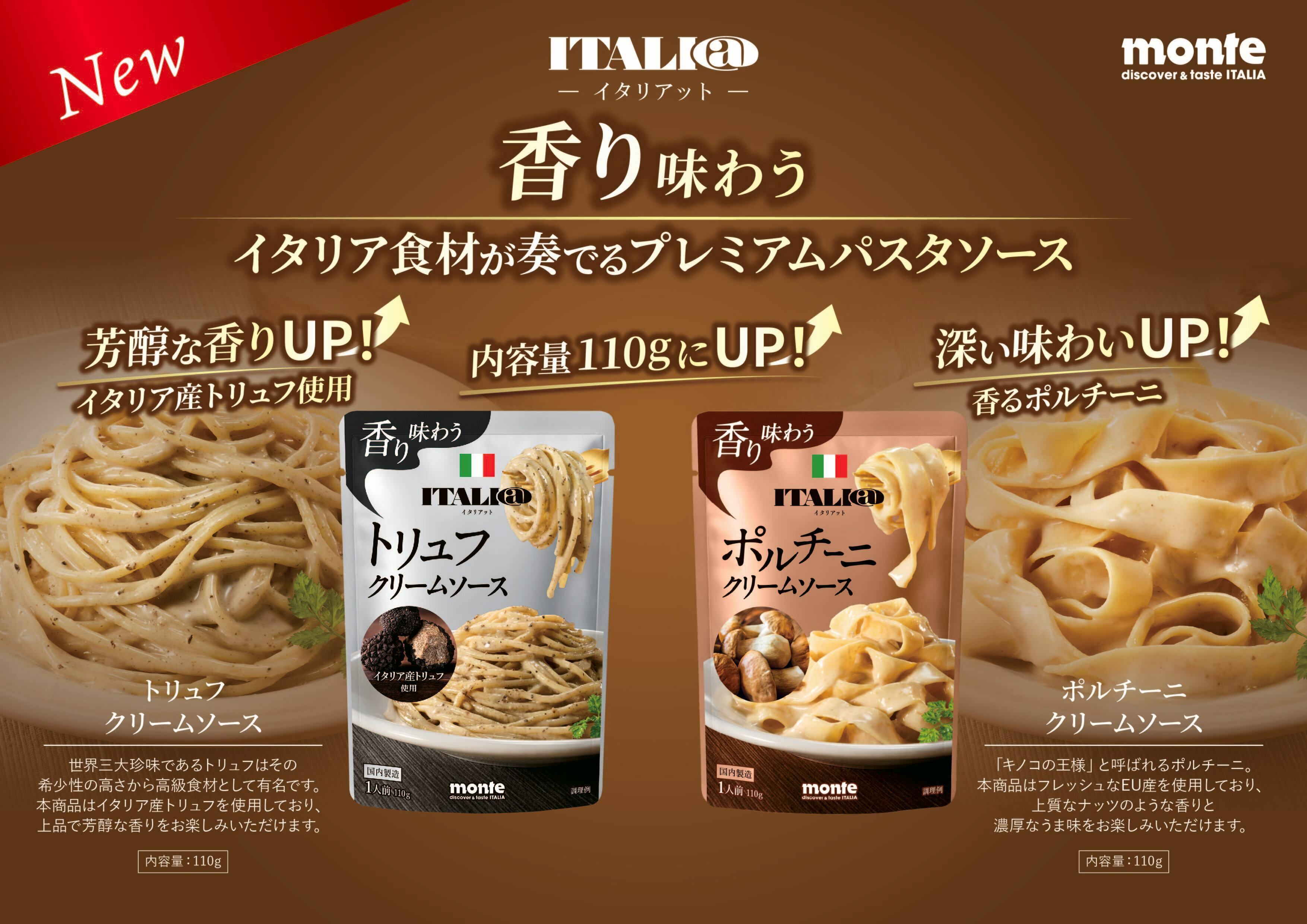 モンテ物産株式会社(本社: 東京都渋谷区、代表取締役社長: 森本明子)は、モンテ物産オリジナルブランド「イタリアット」より、イタリアからの輸入食材を使用した本格派パスタソースシリーズのトリュフクリームソース、ポルチーニクリームソースの2種をリニューアル発売いたします。