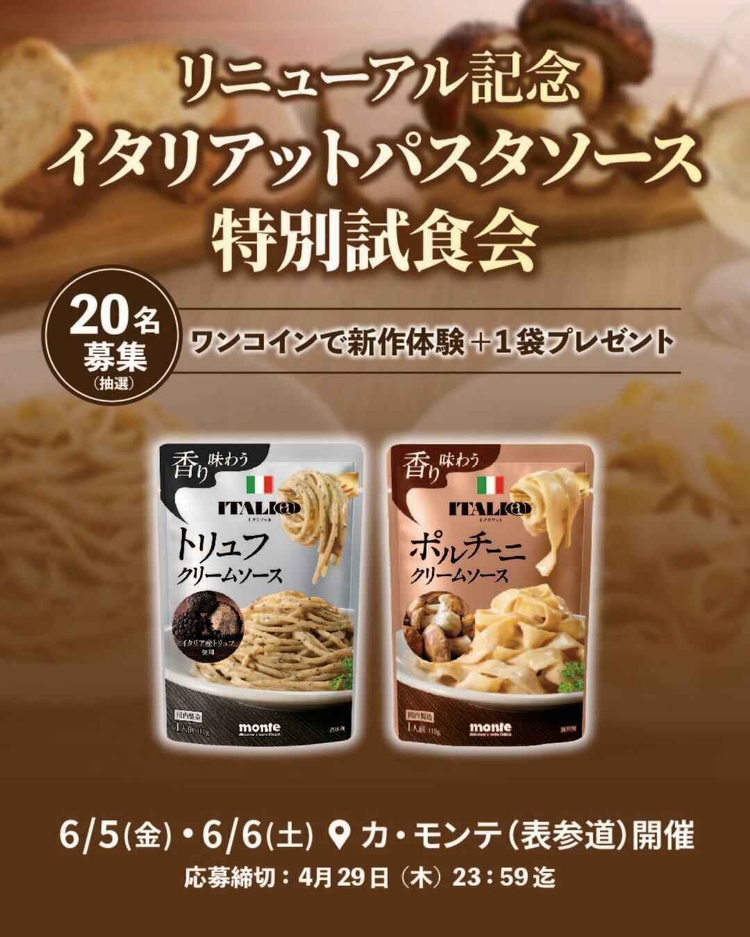 6月5日(金)・6日(土)の2日間、表参道の「カ・モンテ」にて、抽選で20名様限定の特別試食会を開催いたします。