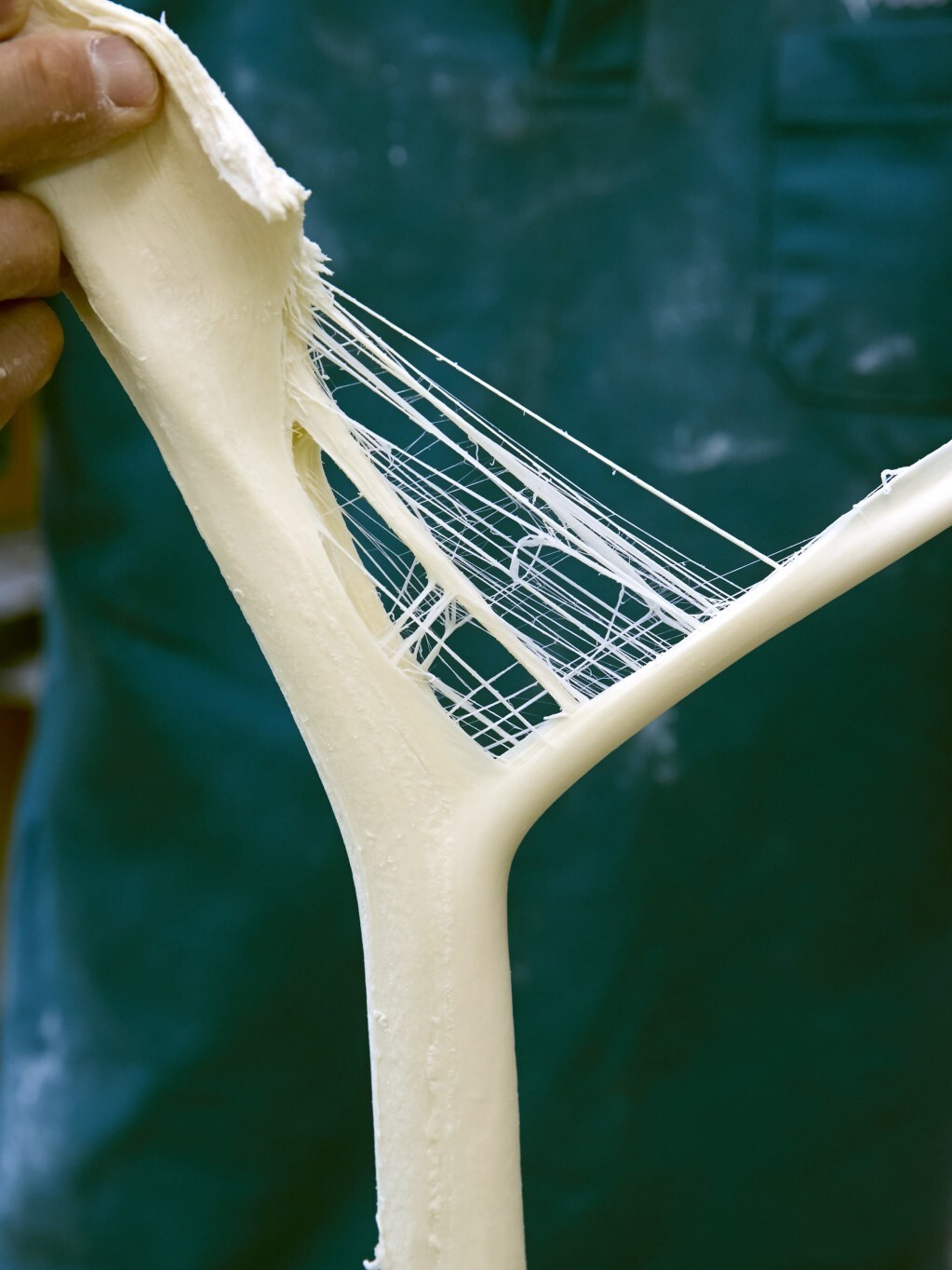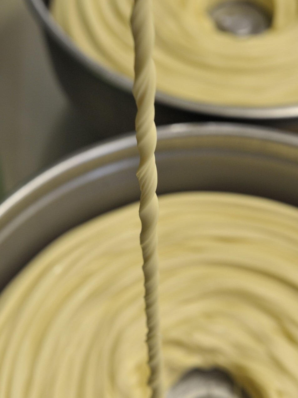 オカベでは、徳島県の半田地域に約300年前から伝わる半田そうめんの伝統製法に加えて、“ねじり”をしっかり効かせているところがポイントです。この工程により、麺の組織がらせん状になり、コシが強くのど越しの良い麺ができあがります。食べた時に押し返すような食感、多少茹でても延びない弾力を作り出します。