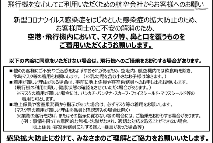 マスク着用:必須。マスクを着用していないお客様(乳幼児または着用が難しい理由があるお客様を除く)は、搭乗を拒否される場合があります。