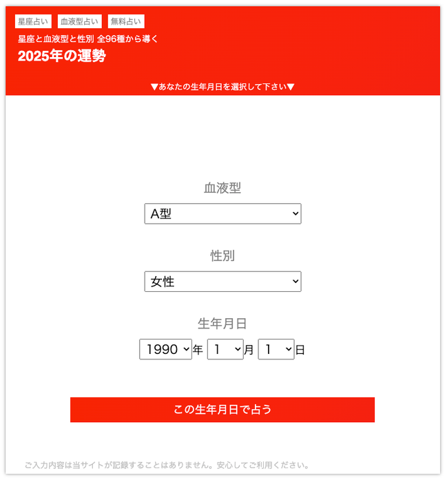 利用者は、①生年月日②血液型③性別の3点からなる全96パターンの区分に分かれた運勢鑑定結果を知り、来る2025年の年間運勢の占い内容と開運のためのアドバイスを受けることができます。