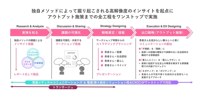 株式会社電通メディカルコミュニケーションズ※1(本社:東京都港区、代表取締役社長執行役員:林 剛、以下「電通メディカルコミュニケーションズ」)と、株式会社電通(本社:東京都港区、代表取締役社長執行役員:榑谷 典洋)における社内組織「第4統合ソリューション局※2」、「カスタマーエクスペリエンス・クリエーティブ・センター(CXCC)※3」、トランサージュ株式会社※4(本社:東京都港区、代表取締役:瀧口 慎太郎、以下「トランサージュ」)は、患者さんを中心とした医療と生活に関わるステークホルダーのインサイトをより高い解像度で掘り下げ、課題抽出から戦略策定、アウトプット施策に至るまでをワンストップで実施する新たなインサイトマーケティングサービスPatient Insight Expressの提供を開始します。