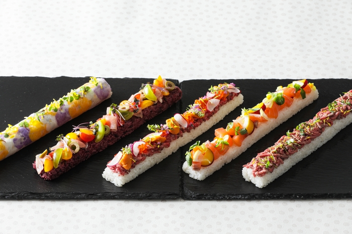 脂がシルクのように光輝く“しあわせ絆牛”と、“いくら・雲丹”などの素材を使用した贅沢な一品をはじめ、イタリアンの食材と酢飯を合わせた創作寿司、エディブルフラワーを甘酢大根で巻き込んだ棒寿司など、様々なシーンにご利用いただけるよう5種類の趣向の異なる棒寿司をご用意。