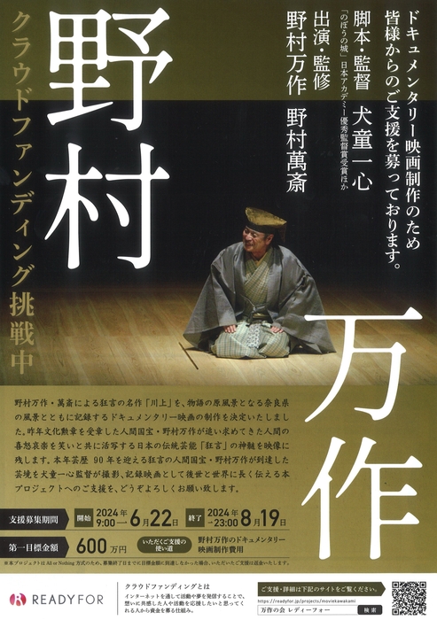 「万作の会」では、狂言師・野村万作の芸を世界と後世に伝える記録映画製作のためのクラウドファンディングを実施中です【~8月19日(月)23:00まで受付中】。