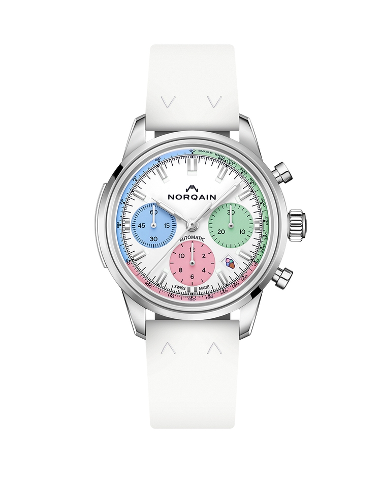 NORQAINコレクションに夏らしさを取り入れるだけでなく、このスペシャルエディションは、2つの注目すべきデザインポイントによって際立っています。まずひとつ目は、クロノグラフの3つのサブダイヤルとそれに合わせた外周セクターが、グリーン、ピンク、ブルーの爽やかなカラーで彩られている点。これはFreedom 60 Chronoとして初の試みです。そしてふたつ目は、毎月1日、8日、15日、22日、29日の5日間、デイト表示が数字の代わりに、3段重ねのアイスクリームのイラストに切り替わること。そのメッセージは「毎週、自分にアイスクリームをプレゼントしよう!」というポジティブなライフスタイルの提案。子どもの頃にアイスクリームトラックを追いかけたような、あの無邪気な喜びを思い出させてくれる、心躍るデザインです。