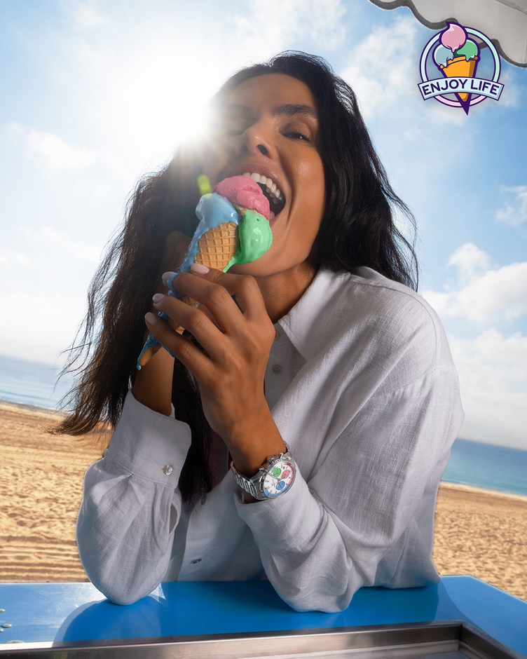 「“Enjoy Life”スペシャルエディションは、誰の中にもいる“子ども心”へのオマージュでもあります。デイト表示の小さなアイスクリームは、ただの遊び心のあるデザインではなく、“もっと肩の力を抜いて人生を楽しもう”というメッセージなのです。子どもの頃の記憶を呼び起こしたり、今の子どもたちの笑顔と重ねたり――この時計は、そんな“ピュアで心が弾むようなエネルギー”を、あなたの毎日に届けてくれます。」