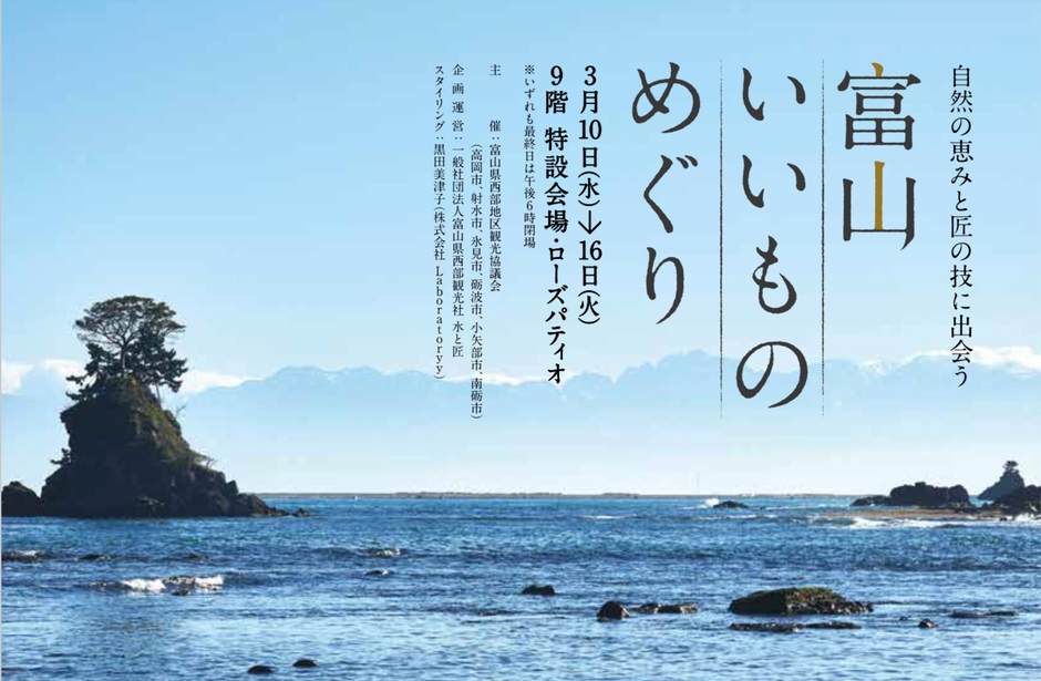 富山県西部地区観光協議会(以下:協議会)は、一般社団法人富山県西部観光社 水と匠(代表理事:稲垣 晴彦)と連携し、アフターコロナを見据えた観光誘客につなげるため、日本有数の売り上げを誇るジェイアール名古屋タカシマヤのリビングフロアにおいて、2021年3月10日(水)~16日(火)まで、「工芸品」や「食」を展示・販売する観光PR事業「富山いいものめぐり」を開催いたします。