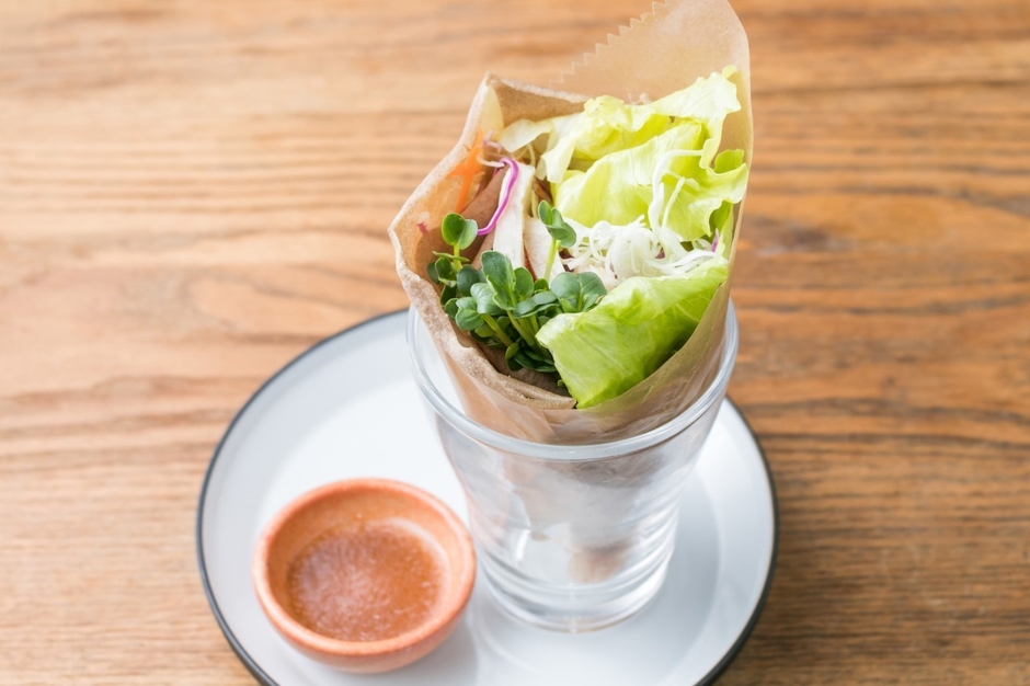 抗酸化効果が期待されるルチンを含むそば粉でつくったクレープで鶏むね肉とレタス、カイワレ大根や赤玉ねぎを包みました。フライパンで焼いているので外はパリパリ、中はシャキシャキとした野菜としっとりと蒸した鶏胸肉、もちもちしたクレープの食感が楽しめます。生地には牛乳とそば粉、中には鶏胸肉を使用したんぱく質もたっぷり摂れるようにしました。