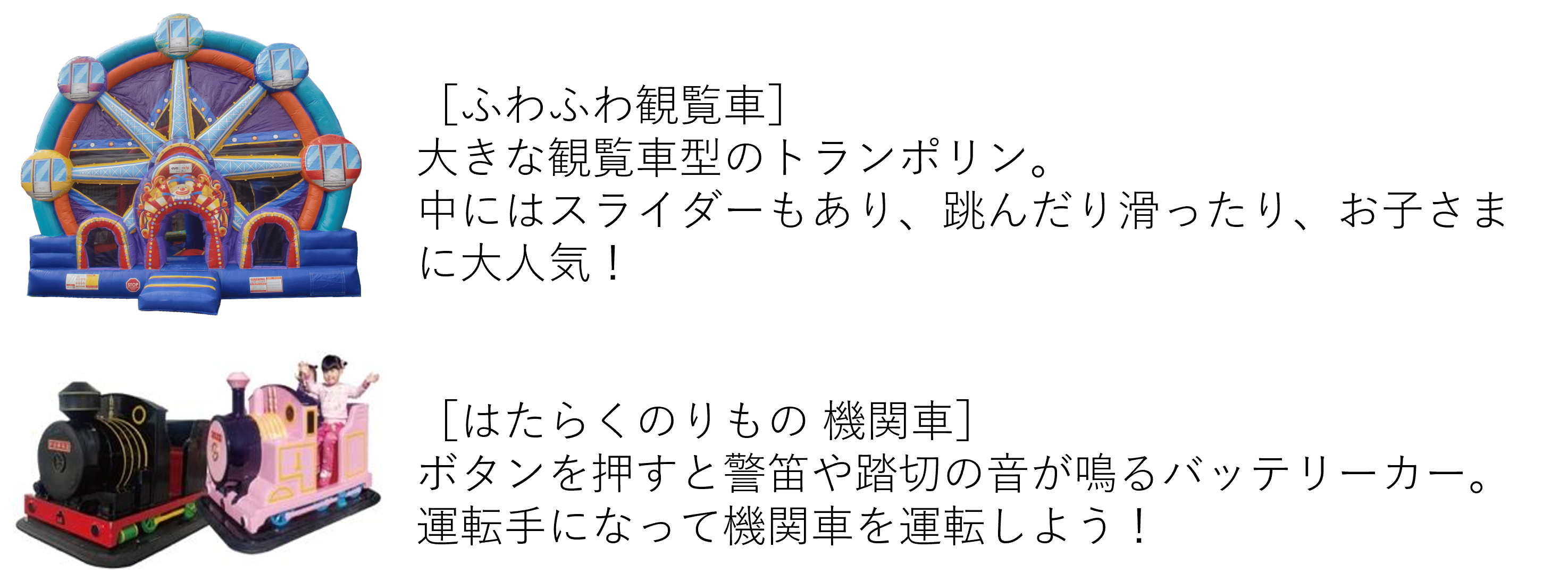 お子さまが安心して遊べるふわふわ遊具や、懐かしい機関車型のバッテリカーが登場します。