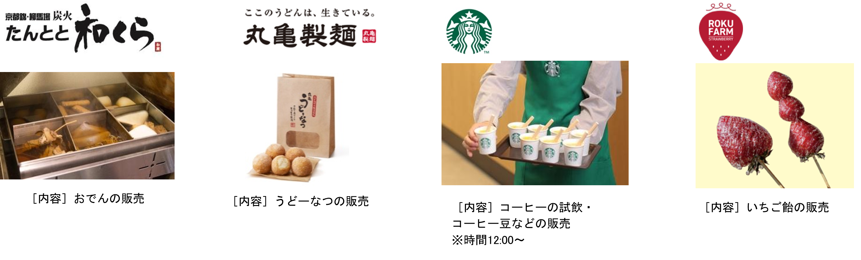 ならファミリー専門店街zoroの店舗から「たんとと和くら」、「丸亀製麺」、「スターバックス」が特別に屋台を出店します。また、地元奈良市で大和いちご“古都華”を育てる農家「6FARM」の出張販売も決定!