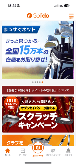 「ゴルフドゥ!」全店でご利用いただけるポイントカード機能です。また、購入・買取り履歴とポイント獲得・利用履歴が閲覧いただけます。