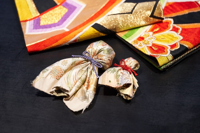 今回の体験では、西陣織の帯を丁寧にほどき、その布を使っててるてる坊主を作ります。一つひとつ柄や色合いが異なり、すべてが一点ものです。