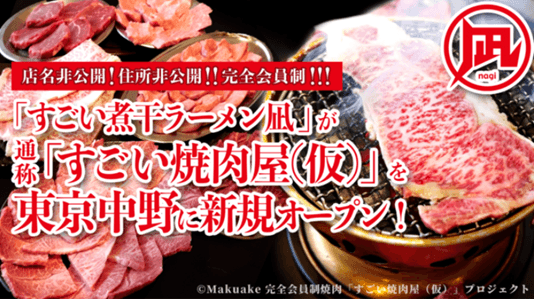 飲食店「すごい煮干ラーメン凪」(以下「ラーメン凪」)を運営する株式会社凪スピリッツジャパン(本社:東京都中央区代表取締役社長:生田 悟志)は、応援購入サービスMakuakeで新業態の「焼肉屋(仮:すごい焼肉屋)」の限定会員の募集を開始いたしました。