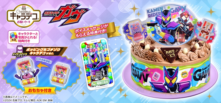 毎年人気のキャラデコシリーズの中でも『仮面ライダーガヴ』のケーキには、別売りの変身ベルト「DX変身ベルトガヴ」と完全連動した「ポッピングミゴチゾウ キャラデコver.」が付属します。