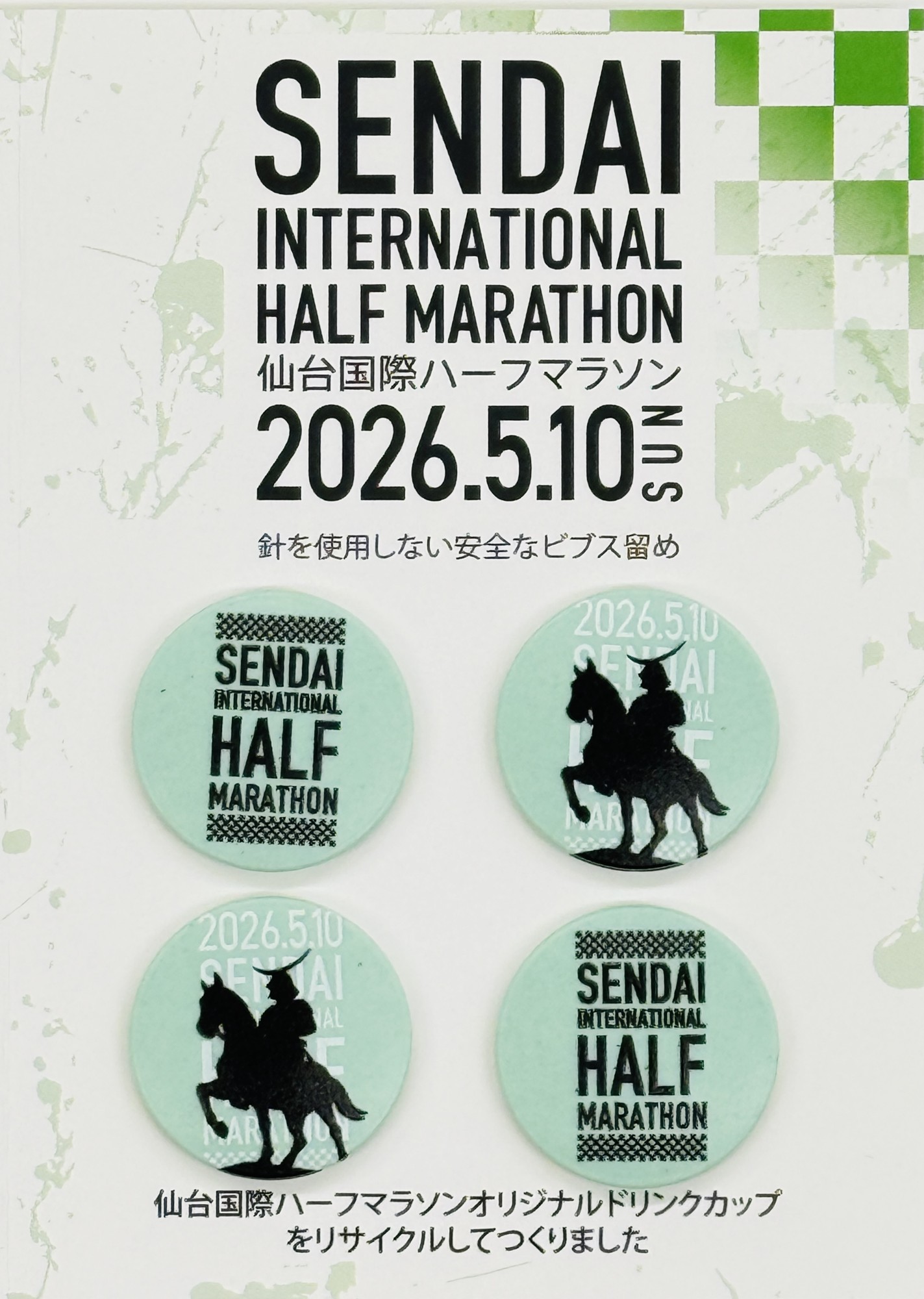 薄いグリーンのビブス留めは、杜の都・仙台の新緑を象徴する大会カラーをそのまま活かしたものです。