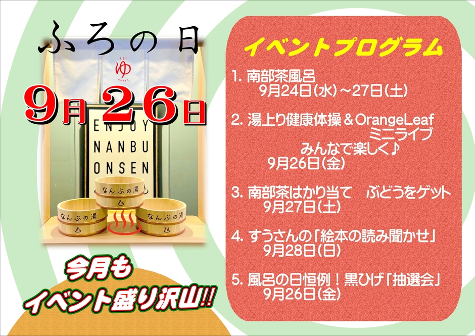 山梨県南部町「森のなかの温泉 なんぶの湯」は2025年9月24日(水)~28日(日)にかけて、「お風呂の日イベント」を開催します。