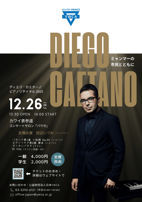 公益財団法人日本YWCA主催、株式会社河合楽器製作所協力『ディエゴ・カエターノ ピアノリサイタル~ミャンマーの市民とともに~』が2025年12月26日(金)にカワイ表参道 コンサートサロン「パウゼ」(東京都渋谷区神宮前5-1)にて開催されます。