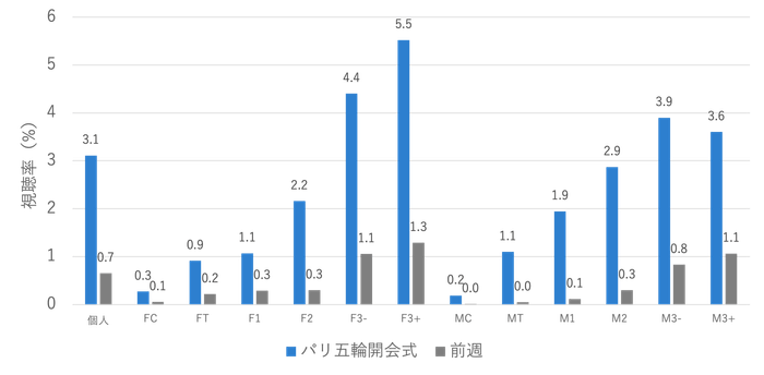 全ての性年代で前週の視聴率を大きく上回り、中でもF3+の視聴率が最も高く5.5%となりました。また、若年層(FT, F1, F2, MT, M1, M2)は前週時点では0.5%未満という非常に低い視聴率だったにも関わらず、今回1〜3%程度の視聴率となっており、オリンピックが幅広い年齢層に訴求できるコンテンツであることが伺えます。