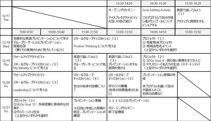 本プログラムは、英語や留学に興味のある生徒だけでなく、理系志望者や英語が苦手な生徒からも参加を募り、文理融合プログラムとしてアクティブ・ラーニング形式で実施します。生徒6名に対し1名の外国人大学生・大学院生が対応し、5日間の会話は原則すべて英語で、SDGsやダイバーシティなどさまざまなテーマについてディスカッションやグループ活動を行います。最終日には、参加した生徒一人ひとりが、学んだことを2分間のプレゼンテーションにして英語で発表します。