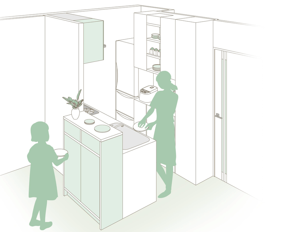 シンク前にキッチン側、ダイニング側の両方から利用できる収納カウンターを設置。家事効率アップと「どこに何があるか分からない」というトラブル減少につながります。