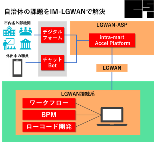 株式会社NTTデータ イントラマート(本社:東京都港区、代表取締役社長:中山 義人)は、子会社の株式会社NTTデータ・イントラマートCSI(本社:東京都品川区、代表取締役社長:加藤 聡司 以下、イントラマートCSI社)がLGWAN-ASPサービス認定の自治体向けソリューション「intra-mart Accel Platform※1 for LGWAN」(以下、IM-LGWAN)をリリースしたことを発表します。自治体職員は、LGWAN接続系端末を介したBPM/ワークフローによる業務プロセス改革に加え、自治体向けに特化した機能を庁内外から利用できることによって、自治体のデジタルトランスフォーメーション(DX)を強力に推進します。