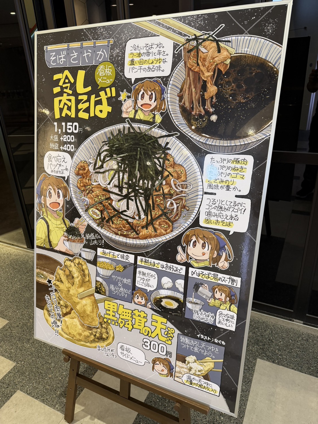 東京・汐留の立ち食いそば「そば さやか」 グルメ漫画家・なぐも氏による 新作メンチ丼の店頭ポスターを掲示