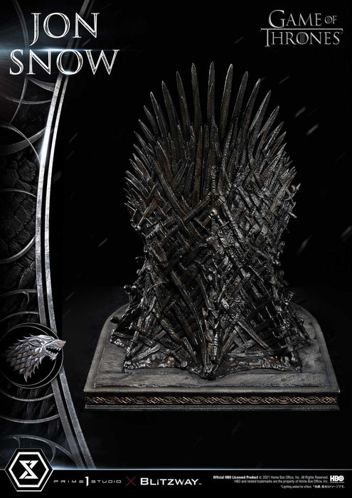 ドラマ『ゲーム・オブ・スローンズ』の“アイコン”ともいうべきこの玉座は、倒した敵たちの剣が無数に重なり合って出来たもの。その複雑な形状を、プライム1の技術により精密に立体化しました。細部に渡ってこだわり抜かれたその造形と質感は、まさに作品の象徴というべき佇まい。なお、ジョン・スノウ本体を取り除き玉座単体でのディスプレイも可能です。