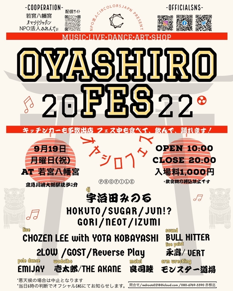 NPO法人CirColorsJapanは、神社の境内という神聖な場をクラブ化し、大人から子供まで広い世代が楽しめるイベント『OYASHIROFes2022(オヤシロフェス2022)』を2022年9月19日に神奈川県川崎市・若宮八幡宮で開催いたします。
