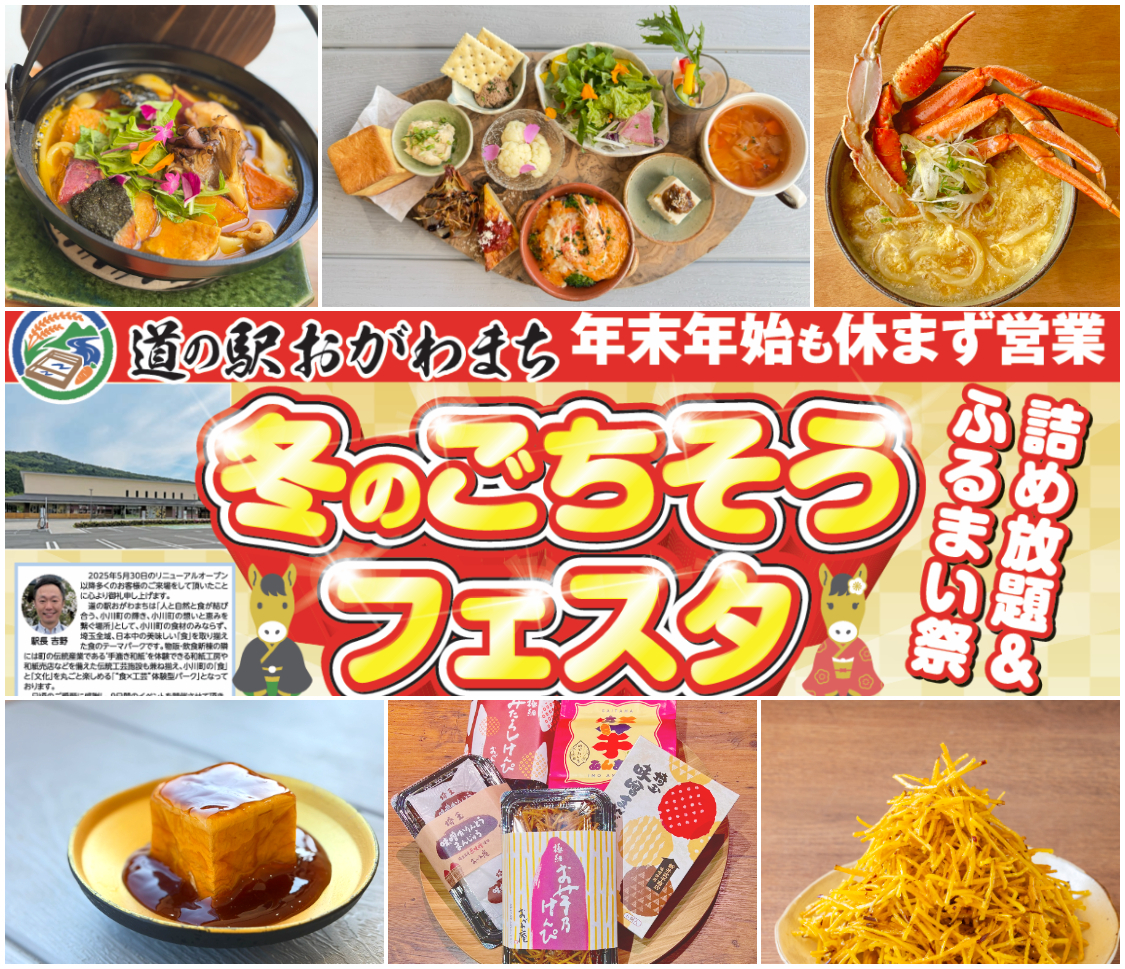 道の駅おがわまちは、体験型イベントを通して旬の味を楽しんでいただき、日頃のご愛顧への感謝をお伝えすることを目的に、年末年始の特別企画を実施します。詰め放題やふるまいのほか、館内飲食店の季節メニューも登場し、この時期ならではの食体験に触れていただける機会をご提供します。