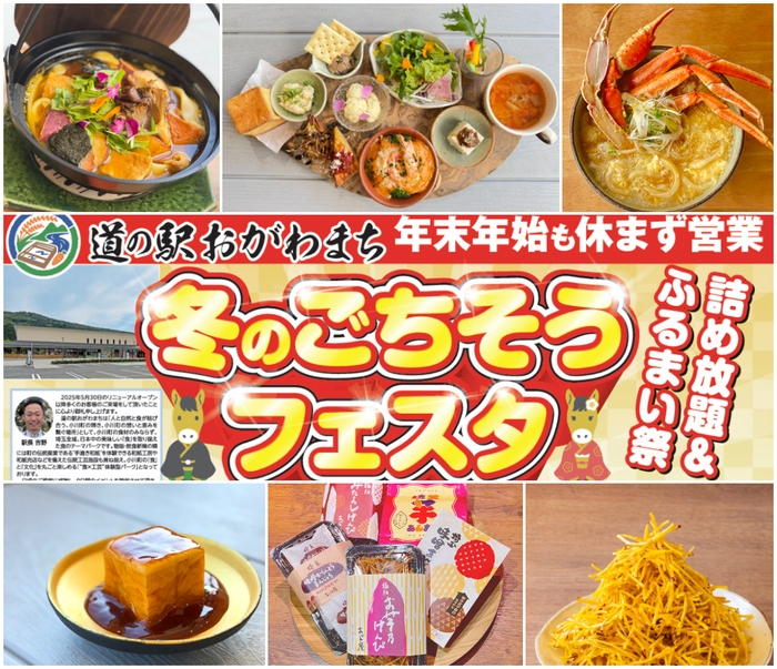 里山ごはん食堂「里山農園プレート“海老とズワイガニのグラタン”」や「蟹かき卵うまトロ餡かけ年明けうどん」、ベーカリーおがわっ子「田舎ぜんざいキューブぱん」等限定グルメまで。