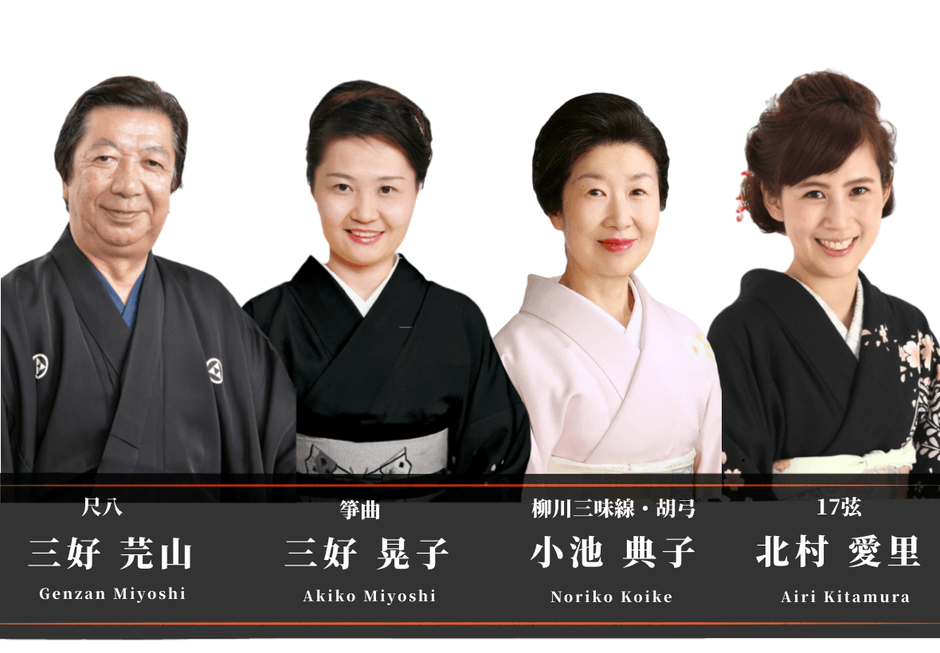 三好芫山(尺八)、三好晃子(筝)、小池典子(柳川三味線・胡弓)、北村愛里(17弦)