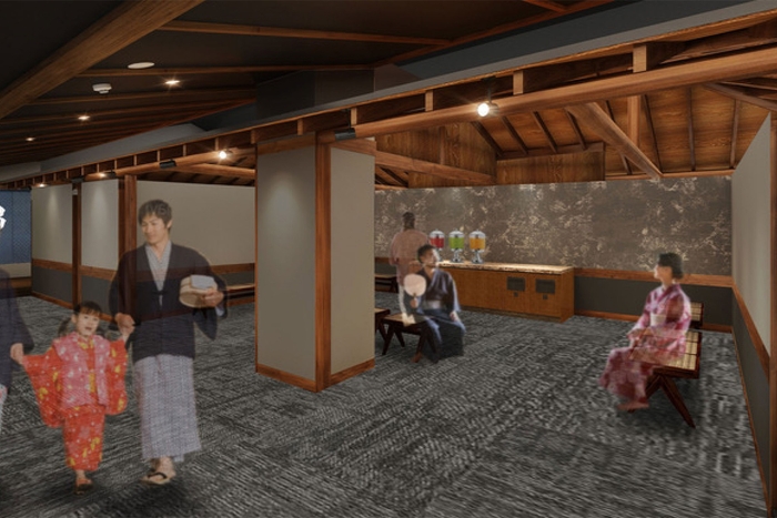 片方の内湯の一部は半露天風呂にリノベーションし、もう片方の露天風呂は格子を一新するなど、今までよりも開放感のある空間で温泉をお楽しみいただけます。また、洗い場に仕切りを設けるなど、使い勝手の良さにも配慮いたしました。伊香保の名湯を楽しんだ後は、大屋根をモチーフにしたデザインの和情緒あふれる湯上りラウンジでゆっくりと喉をうるおしてください。