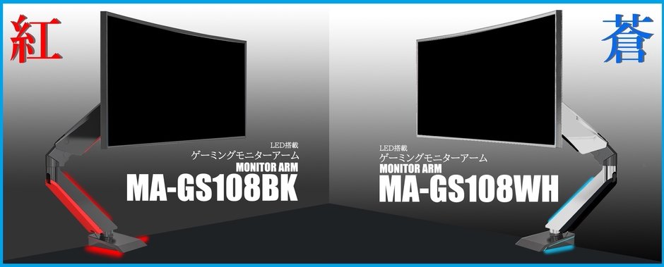 LED搭載ゲーミングモニターアーム【MA-GS108】は、台座と第1アームにLEDを搭載し第2アームにガススプリングを内蔵した高性能ゲーミング液晶モニターアームです。