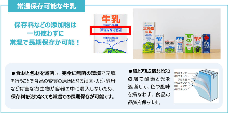 冷蔵保存が不要なため、お出かけ先などに牛乳を持ち運ぶことができます。