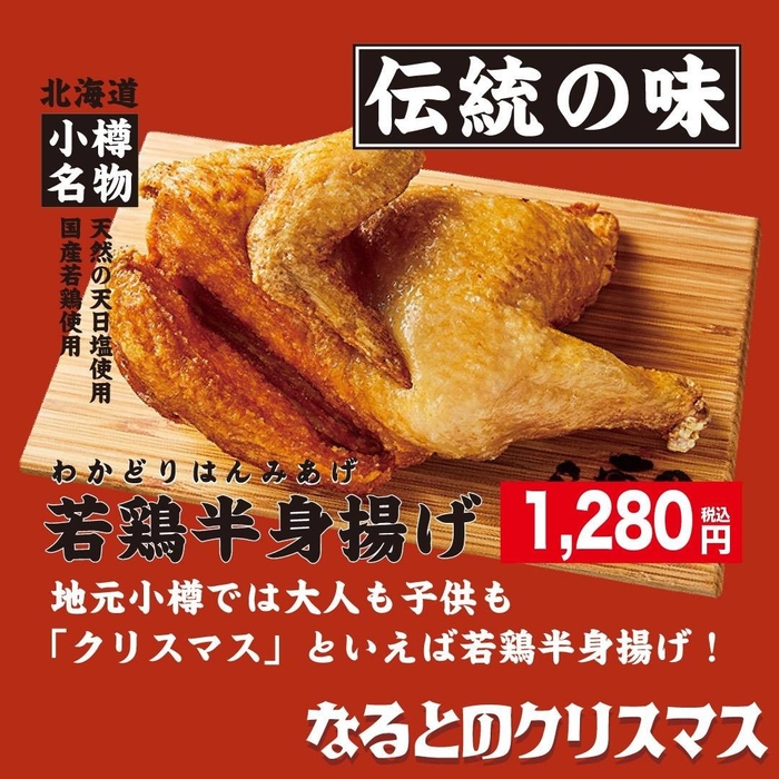 今年は小樽のソウルフードとして親しまれている「若鶏半身揚げ」はもちろん、人気の名物ザンギ(唐揚げ)を楽しめるオリジナルソース付きの豪華クリスマスチキンBOXをご用意。外はパリッと、中はふっくらジューシーな鶏が、クリスマスの特別な食卓を華やかに彩ります。ご家族・ご友人・恋人との大切なひとときを、ぜひ〈なるとキッチン〉のチキンとともにお過ごしください。全国のなるとキッチン店舗にて、現在ご予約を受け付けております。詳細はこちら: