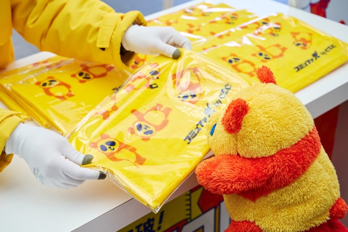 コミュファ光のスタッフがワイファイくんに見せてくれたのは、今回のイベント限定で配られている、オリジナルグッズのフェイスタオルとポーチ。受け取るためには、条件があるようです。