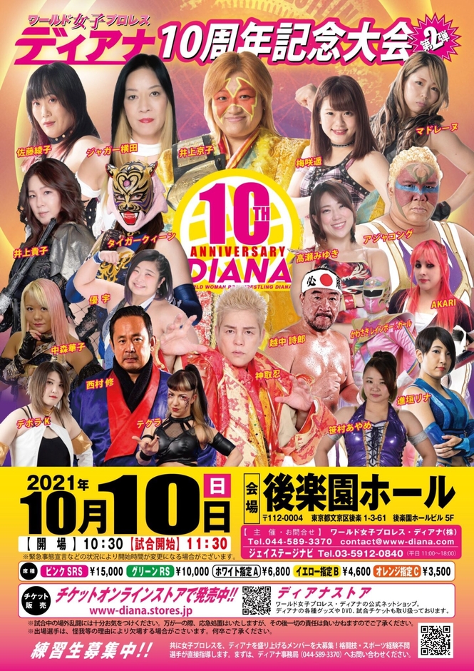 チケットはDiana公式オンラインストア( https://www-diana.stores.jp )で販売中です。本大会では、多くの女性の方々からいただいた声を受けて、女性限定シート(3,000円)を席数限定で新設しました、この機会にぜひプロレス体験をお楽しみください。