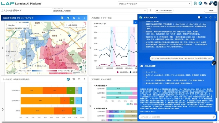 位置情報ビッグデータと生成AIを組み合わせて、企業や自治体の業務を支援する人流データ活用プラットフォーム「Location AI Platform®(以下、LAP)」を提供するクロスロケーションズ株式会社(東京都渋谷区、代表取締役:小尾 一介、以下「クロスロケーションズ」)は、LAPで可視化された人流データをChatGPTのADA機能※1で分析し、対話型で自然な回答を導き出す『AIアシスタント』機能を新たに実装しました。これにより、ユーザーは生成AIとの対話を通じて人流データをより直感的に理解し、活用の可能性を一層広げることができます。