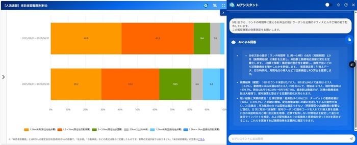 『AIアシスタント』は、本年3月に「LAP」と「人流アナリティクス🄬」に実装して提供を開始した「AIサマリー」をさらに進化させた機能です。 「AIサマリー」は、LAPユーザーおよび人流アナリティクスユーザーに提供されており、すでに1,500以上のアカウントで利用されています。