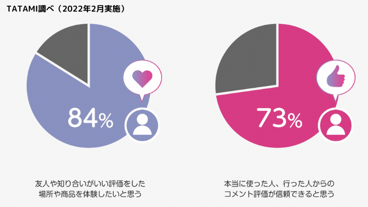 コロナをきっかけに中国では口コミ文化が急速化しており、TATAMIが中国人400名にとったアンケートでは(2022年2月実施)、商品・サービスを検討する際、84%の人が「知人が良い評価をした商品・サービスを体験したい」、73%の人が「本当に使った・行った人からの評価が信頼できる」と答えています。