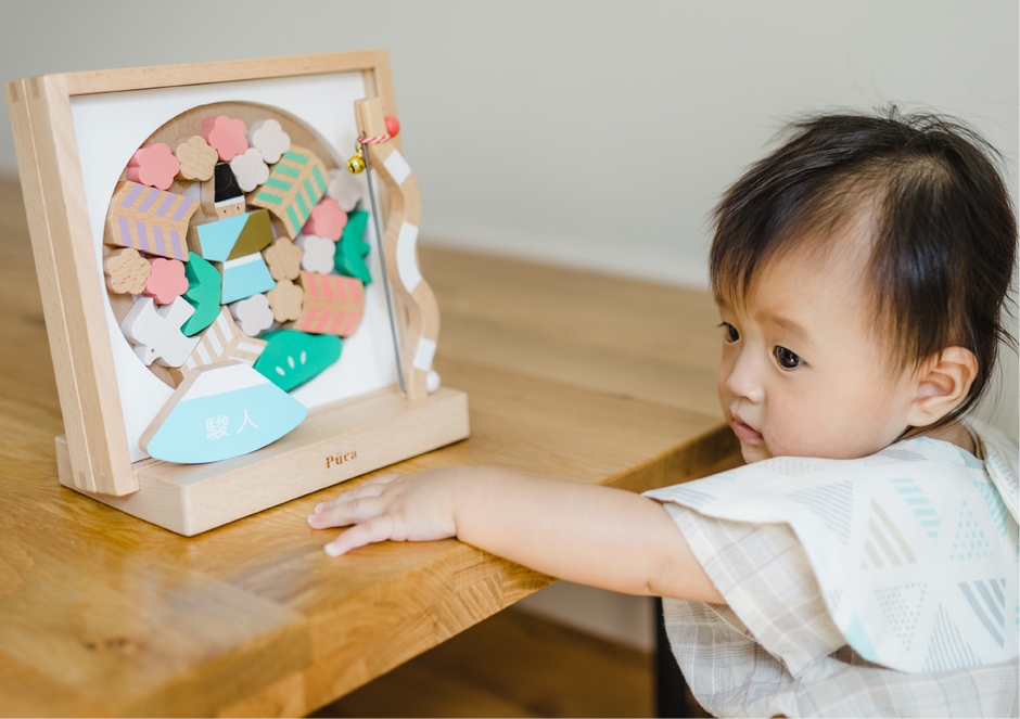 赤ちゃんがはじめて迎える初正月のお祝いとして、男の子に贈る「破魔弓」。お正月に飾ってお祝いすることはもちろん、プーカのコンセプトである触って楽しめる知育要素を取り入れたかわいい破魔弓ができました。