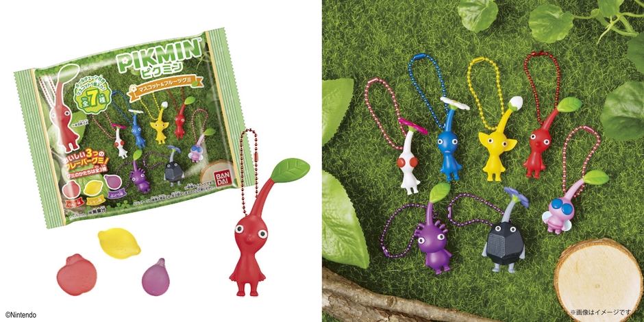 任天堂株式会社が発売するゲームシリーズ「ピクミン」のマスコット付きグミ。果実の形をイメージしたグミの味は、りんご味、レモン味、ぶどう味の全3種。カラーボールチェーンがついた約5cmのピクミンのマスコットは全7種。お気に入りのピクミンをたくさん連れて持ち歩こう!
