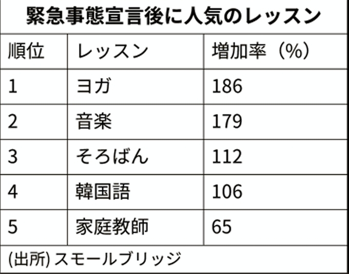 オンラインで語学などの習い事を提供するスモールブリッジ(東京・渋谷)が緊急事態宣言後1カ月で人気になったレッスンを調べたところ、1位は「ヨガ・ワークアウト」で、対面で学ぶ教室に行けなくなり、オンラインに移行する人が増えています。