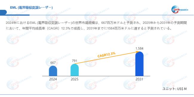 QYResearchが発表した新たな市場調査レポート「EML(電界吸収変調レーザー)―グローバル市場シェアとランキング、全体の売上と需要予測、2026~2032」によると、世界のEML(電界吸収変調レーザー)市場規模は2024年の約667百万米ドルから2025年の791百万米ドルへと順調に拡大すると見込まれ、予測期間中は年平均成長率(CAGR)12.3%で成長し、2031年には1584百万米ドルに達すると予測されている。