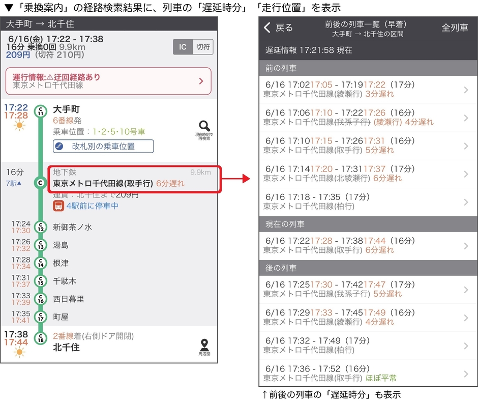 「乗換案内」が東京メトロ「列車運行情報データ」と連携 列車ごとのリアルタイムな遅延時分と走行位置が確認可能に